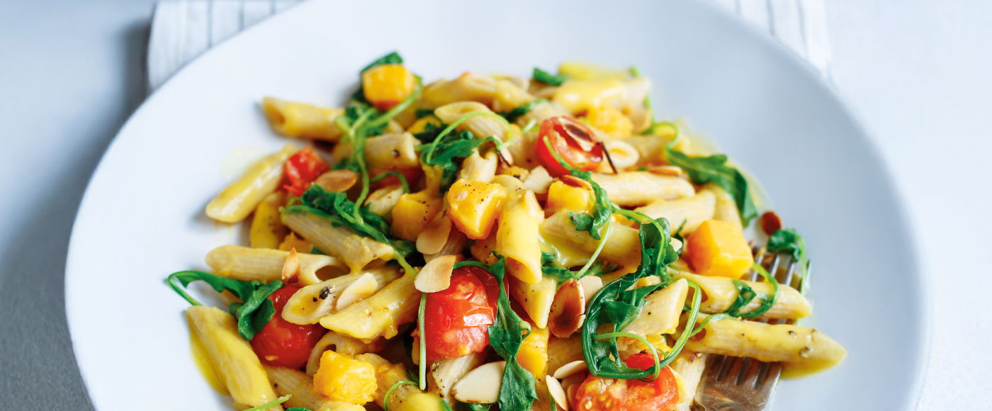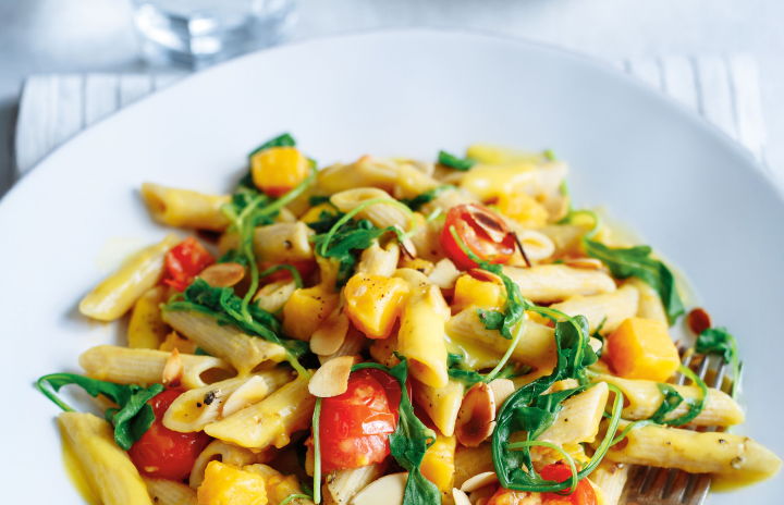 Pour un plat nourrissant et équilibré, on savoure la courge musquée de deux façons: on en réduit une partie au mélangeur pour faire une sauce onctueuse avec de la roquette et du cheddar, tandis que le reste est poêlé avec de l’ail et des tomates cerises pour plus de texture et d’éclat. On enrobe le mélange de pâtes de blé entier et on obtient un repas complet et savoureux.