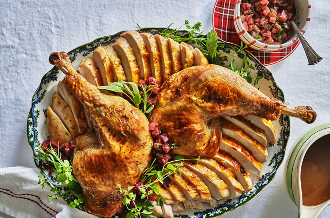 Chaque année, on cherche à préparer un dindon parfait, doré à point et bien juteux. Tout ce qu’on trouve compliqué dans ce plat traditionnel des fêtes est maintenant simplifié: en séparant les cuisses de la poitrine, on réduit le temps de macération en plus de faciliter et de mieux contrôler la cuisson. Sans parler du chutney aux poires et au gingembre, qui apporte un parfum rappelant celui des atocas. On dit oui à un dindon prêt en moins de deux!