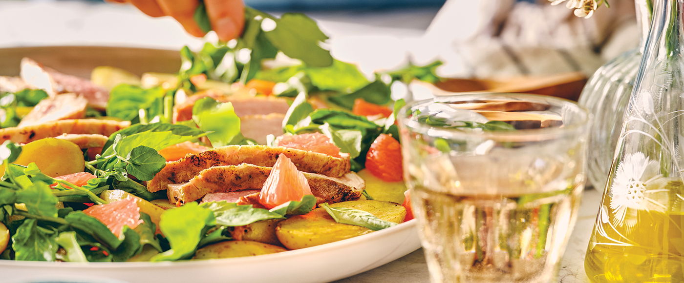 Pork, potatoes, grapefruit; this is the trio you’ll want all summer long. This recipe speaks to the simplicity of grilling, with pork chops coated in a salt, garlic and pepper dry rub that marinates quickly. Grapefruit is the surprise ingredient here and fits perfectly. Serve with potatoes in a foil packet on the side.