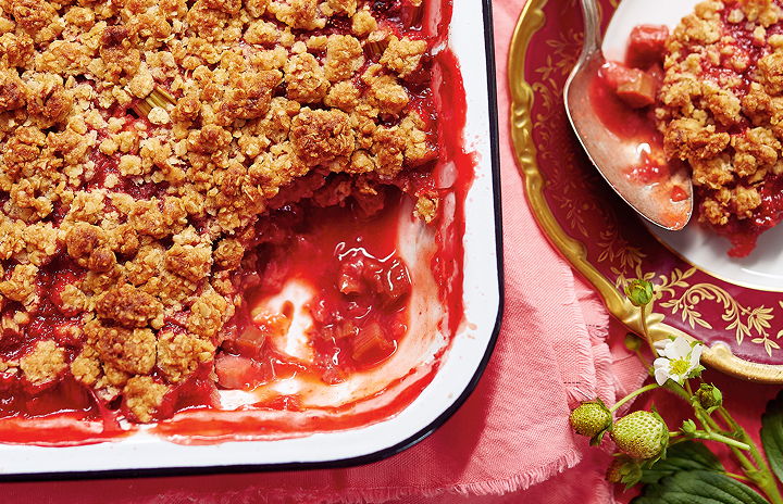 Once more, it’s impossible to resist the mixture of sweet strawberries and tangy rhubarb. Cover with sweet and crunchy oat topping and you’ve got a warm dessert with just the right textural contrast.